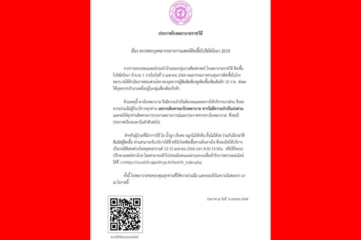 โรงพยาบาลราชวิถี ออกประกาศเรื่อง ตรวจพบบุคคลากรทางการแพทย์ติดเชื้อไวรัสโคโรนา 2019 ( COVID-19) ระบุว่า จากการตรวจพบแพทย์ประจําบ้านของกลุ่มงานศัลยศาสตร์ โรงพยาบาลราชวิถี ติดเชื้อไวรัสโคโรนา จํานวน 1 คน ในวันที่ 5 เม.ย.ที่ผ่านมา คณะกรรมการควบคุมการติดเชื้อในโรง พยาบาลได้ดําเนินการสอบสวนโรค พบบุคลากรผู้สัมผัสเสี่ยงสูงติดเชื้อเพิ่มเติมอีก 10 คน ส่งผลให้บุคลากรจํานวนหนึ่งอยู่ในกลุ่มเสี่ยงต้องกักตัว