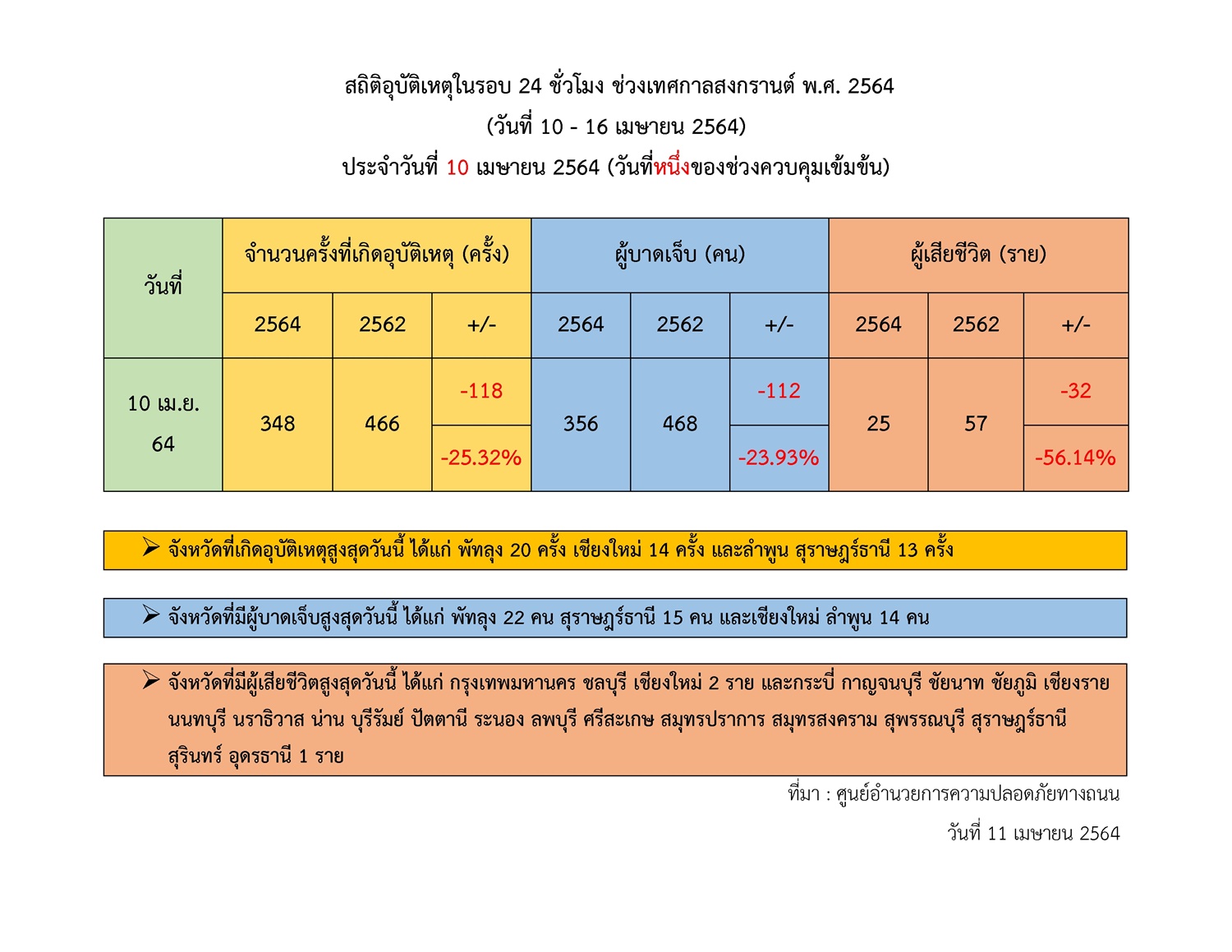โดยจังหวัดที่เกิดอุบัติเหตุสูงสุดคือ จ.พัทลุง จำนวน 20 ครั้ง จังหวัดที่มีผู้เสียชีวิตสูงสุด คือกรุงเทพมหานคร(กทม.) ชลบุรีและเชียงใหม่ จังหวัดละ 2 ราย จังหวัดที่มีผู้บาดเจ็บสูงสุด คือจังหวัดพัทลุง 22 คน ทั้งนี้ ได้มีการจัดตั้งจุดตรวจหลัก 1,913 จุด เจ้าหน้าที่ปฏิบัติงาน 60,201 คน เรียกตรวจยานพาหนะ 342,028 คัน มีผู้ถูกดำเนินคดี รวม58,372 ราย มีความผิดฐานไม่สวมหมวกนิรภัย 14,852 ราย ไม่มีใบขับขี่ 16,125 ราย ถนนหลายสายยังคงมีปริมาณรถหนาแน่นต่อเนื่องมาตั้งแต่เมื่อคืนวันที่10 เม.ย.ที่ผ่านมา โดยเฉพาะเส้นทางเชื่อมต่อไปยังภูมิภาคต่าง ๆ และเส้นทางเลี่ยงเมือง ซึ่งตนได้สั่งการเน้นย้ำหน่วยปฏิบัติในระดับพื้นที่เพิ่มความเข้มข้นของด่านชุมชน จุดตรวจ และจุดสกัดในพื้นที่ชุมชน หมู่บ้าน โดยเฉพาะจุดเสี่ยงเกิดอุบัติเหตุบ่อยครั้ง เฝ้าระวังผู้ขับขี่ที่มีพฤติกรรมเสี่ยงดื่มแล้วขับ ขับรถเร็ว และเข้มงวดการจำหน่ายเครื่องดื่มแอลกอฮอล์ตามกฎหมายกำหนด เพื่อลดปัจจัยเสี่ยงการเกิดอุบัติเหตุ ควบคู่กับการป้องกันการแพร่ระบาดของโรคติดเชื้อไวรัสโควิด-19 ด้วยแล้ว