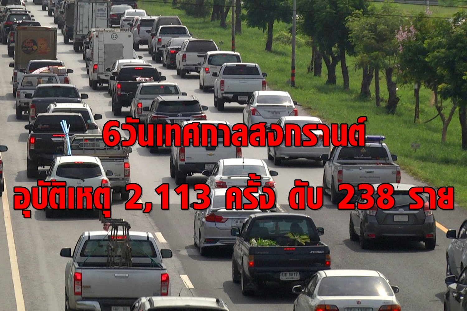 ศปถ.รายงานยอดอุบัติเหตุสะสมช่วง 6 วันสงกรานต์ พบเกิดอุบัติเหตุรวม 2,113 ครั้ง ผู้เสียชีวิตรวม 238 ราย ผู้บาดเจ็บ รวม 2,116 คน สาเหตุหลัก ดื่มแล้วขับ ขับรถเร็ว