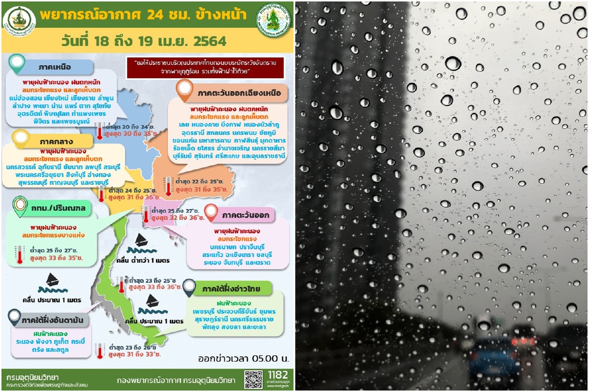 เมื่อวันที่ 18 เม.ย. 64 กรมอุตุนิยมวิทยารายงาน ลักษณะอากาศทั่วไปว่า พยากรณ์อากาศ 24 ชั่วโมงข้างหน้า บริเวณภาคเหนือ ภาคตะวันออกเฉียงเหนือ ภาคตะวันออก และภาคกลาง รวมทั้งกรุงเทพมหานครและปริมณฑล มีพายุฤดูร้อนเกิดขึ้น โดยมีลักษณะของพายุฝนฟ้าคะนอง ลมกระโชกแรง และมีลูกเห็บตก รวมถึงอาจมีฟ้าผ่าเกิดขึ้นกับมีฝนตกหนักบางแห่ง ขอให้ประชาชนบริเวณดังกล่าวระมัดระวังอันตรายจากพายุฤดูร้อน รวมทั้งฟ้าผ่าไว้ด้วย