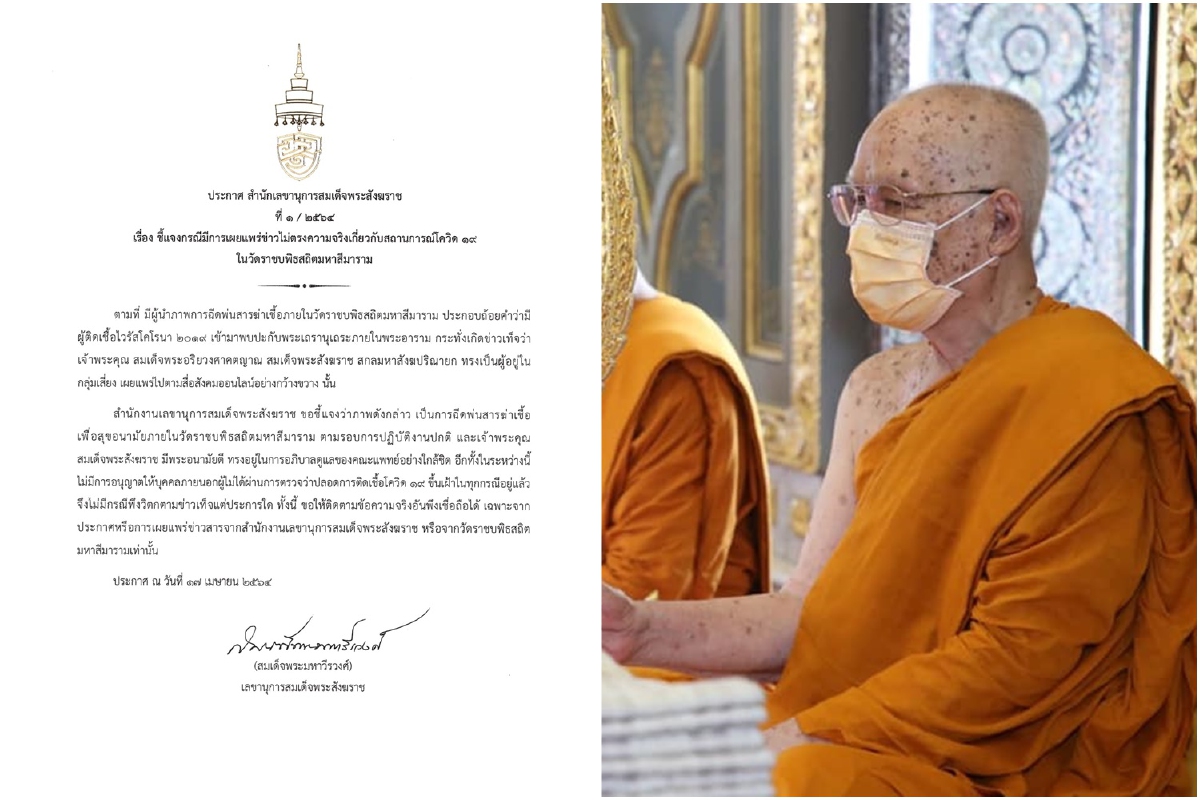 เมื่อวันที่ 17 เม.ย. 64 สำนักงานเลขานุการสมเด็จพระสังฆราช ได้ออกประกาศเรื่อง "ชี้แจงกรณีมีการเผยแพร่ข่าวไม่ตรงความจริงเกี่ยวกับสถานการณ์โควิด19 ในวัดราชบพิธสถิตมหาสีมาราม"