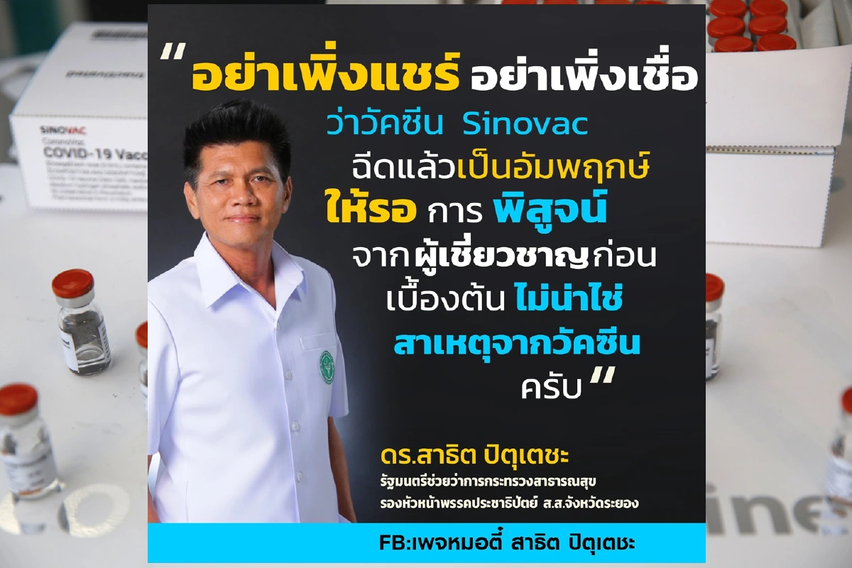 นายสาธิต ปิตุเตชะ รัฐมนตรีช่วยว่าการกระทรวงสาธารณสุข ระบุผ่านเฟซบุ๊กชี้แจงประเด็นข้อมูลผลข้างเคียงขากการฉีดวัคซีนซิโนแวคที่โรงพยาบาลในจังหวัดระยอง โดยระบุว่า
