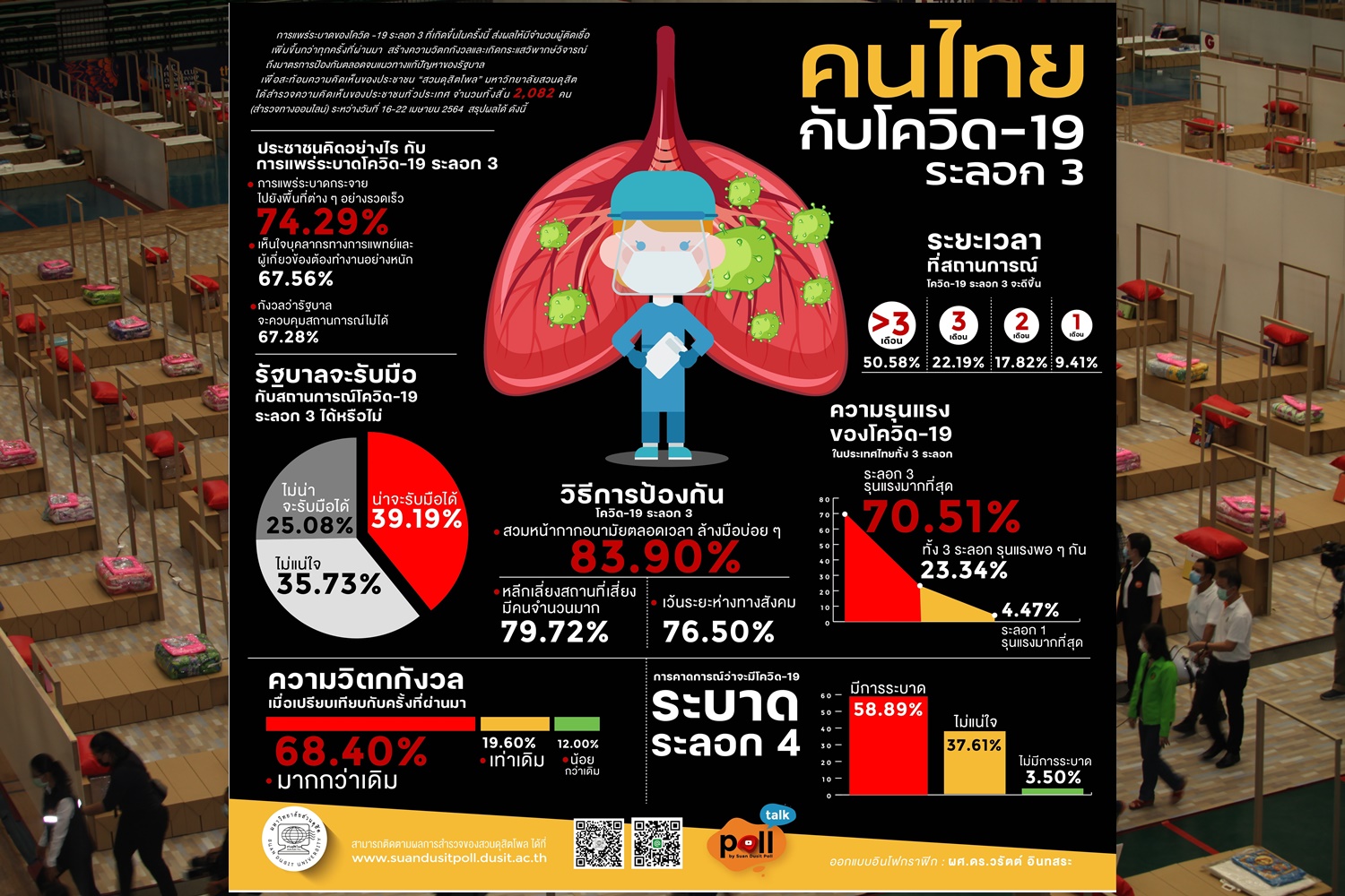 สวนดุสิตโพล มหาวิทยาลัยสวนดุสิตเปิดเผย ผลสำรวจความคิดเห็นของประชาชนต่อกรณี “คนไทยกับโควิด-19 ระลอก 3” กลุ่มตัวอย่างจำนวน 2,082 คน สำรวจวันที่ 16-22 เมษายน 2564 พบว่า