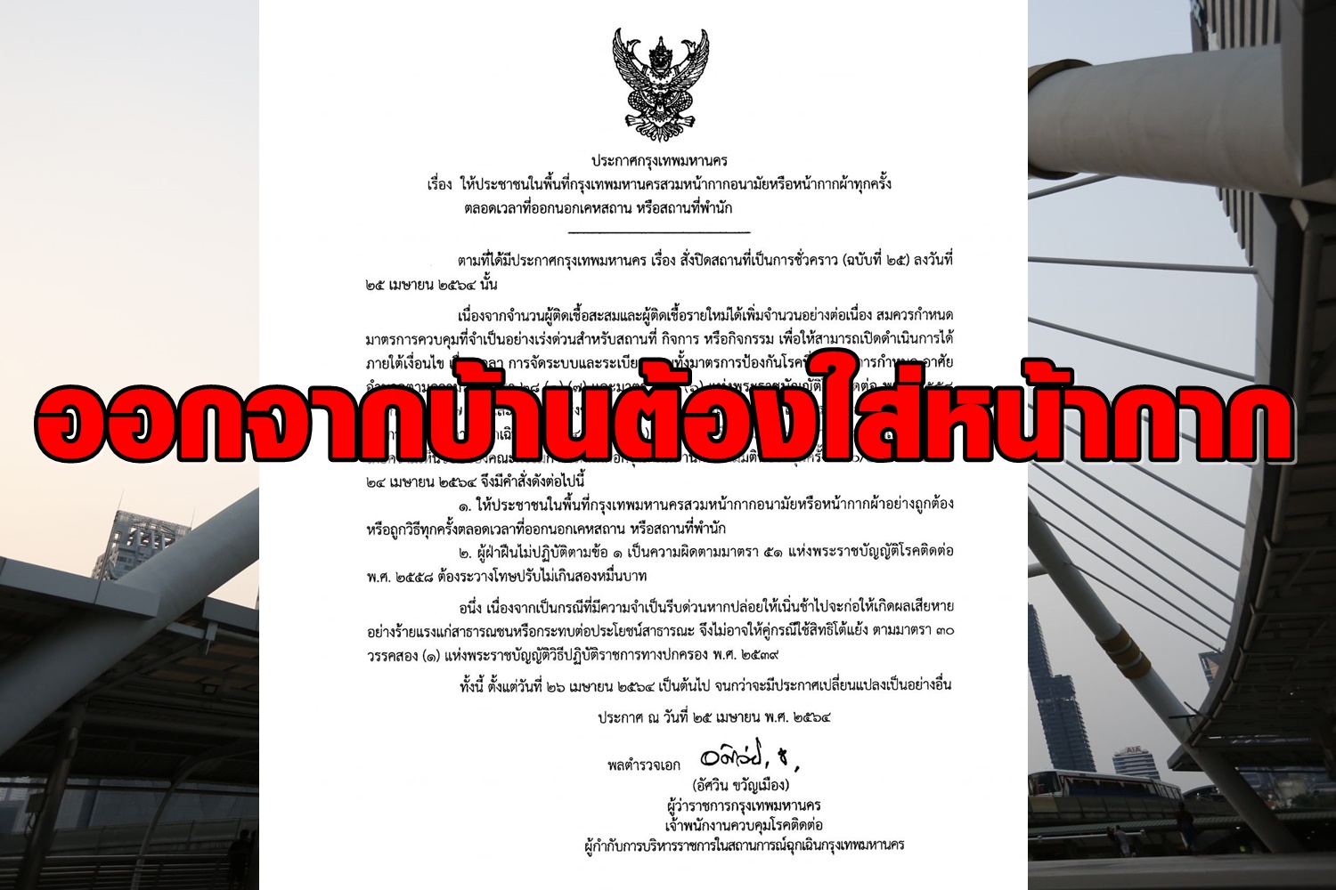 เริ่มบังคับใช้ 26 เม.ย. 64 กทม.ประกาศให้ประชาชนสวมหน้ากากอนามัยหรือหน้ากากผ้า "อย่างถูกวิธี" ตลอดเวลาที่อยู่นอกสถานที่พำนัก ฝ่าฝืนมีโทษปรับ 2 หมื่นบาท