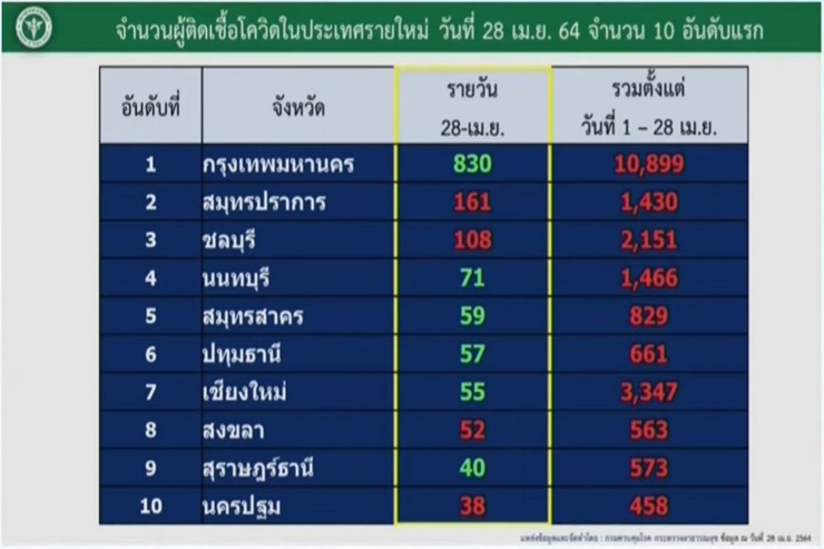 ศบค. เปิด 10 อันดับ จังหวัด ติดเชื้อโควิดสูงสุด วันนี้ กทม.อันดับหนึ่ง 830 ราย รวม 1-28 เม.ย. แตะ 10,899 ราย รองลงมา สมุทรปราการ 161 ราย,ชลบุรี 108 ราย,นนทบุรี 71 คน และสมุทรสาครที่ 5 ป่วย 59 ราย