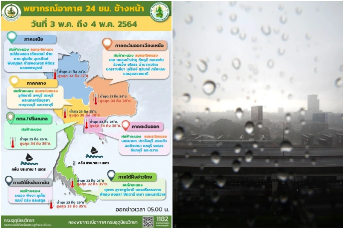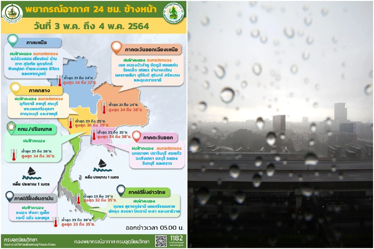 เมื่อวันที่ 3 พ.ค. 64 กรมอุตุนิยมวิทยารายงานลักษณะอากาศทั่วไปว่า พยากรณ์อากาศ 24 ชั่วโมงข้างหน้า ลมใต้และลมตะวันออกเฉียงใต้พัดปกคลุมประเทศไทยตอนบน ทำให้ประเทศไทยตอนบนยังคงมีฝนฟ้าคะนอง และมีลมกระโชกแรงบางแห่งในภาคเหนือ ภาคตะวันออกเฉียงเหนือ ภาคกลาง และภาคตะวันออก ขอให้ประชาชนบริเวณดังกล่าวระวังอันตรายจากฝนฟ้าคะนองและลมกระโชกแรง เกษตรกรควรเตรียมการป้องกันและระวังความเสียหายที่จะเกิดต่อผลผลิตทางการเกษตรในระยะนี้ไว้ด้วย