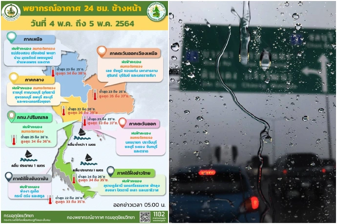 เมื่อวันที่ 4 พ.ค. 64 กรมอุตุนิยมวิทยารายงาน ลักษณะอากาศทั่วไปว่า พยากรณ์อากาศ 24 ชั่วโมงข้างหน้า ลมใต้และลมตะวันออกเฉียงใต้พัดปกคลุมประเทศไทยตอนบนมีกำลังอ่อนลง ทำให้บริเวณดังกล่าวมีฝนฟ้าคะนองลดลง แต่ยังคงมีลมกระโชกแรงเป็นพื้นที่ ขอให้ประชาชนบริเวณดังกล่าวระวังอันตรายจากฝนฟ้าคะนองและลมกระโชกแรง เกษตรกรควรเตรียมการป้องกันและระวังความเสียหายที่จะเกิดต่อผลผลิตทางการเกษตรในระยะนี้ไว้ด้วย