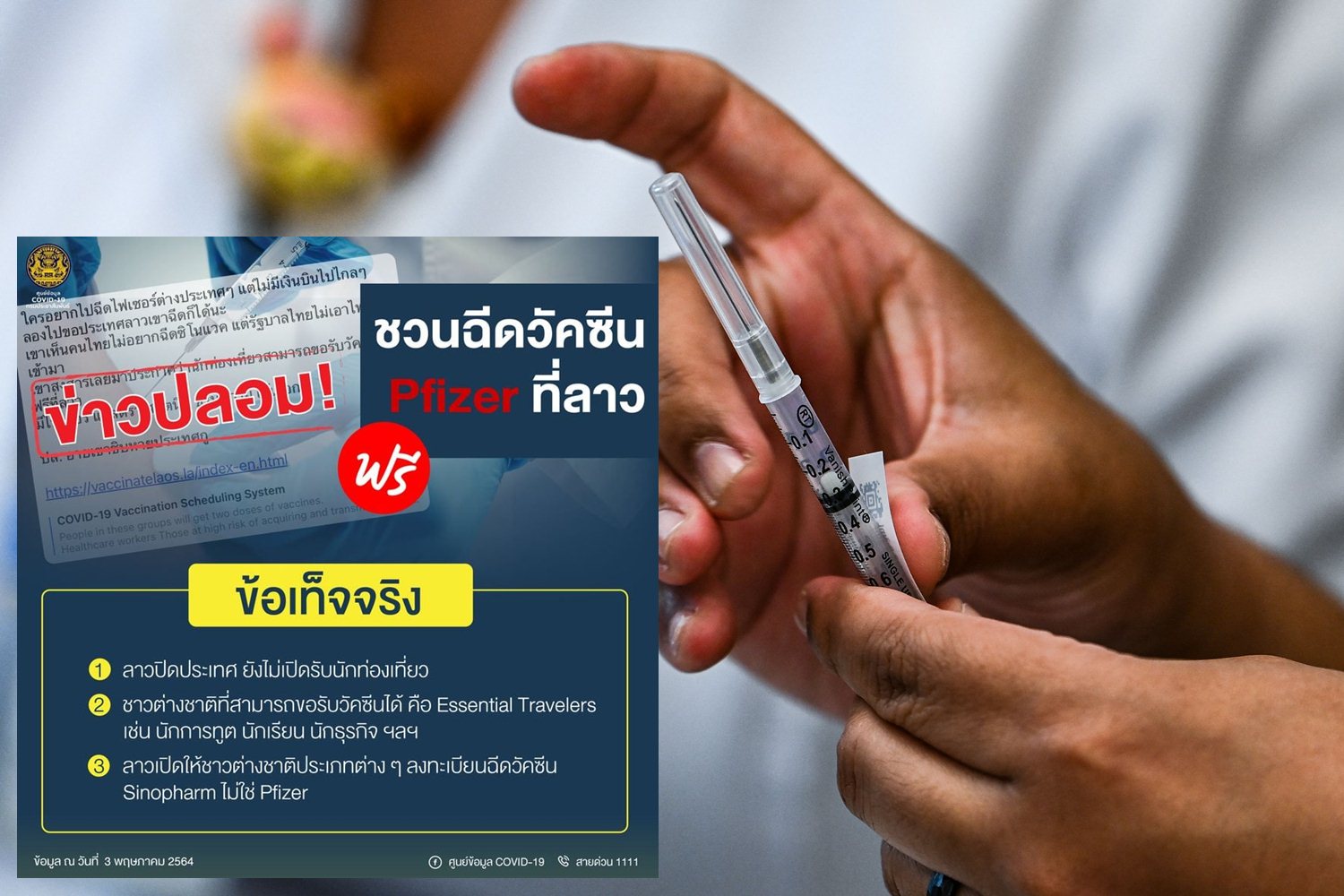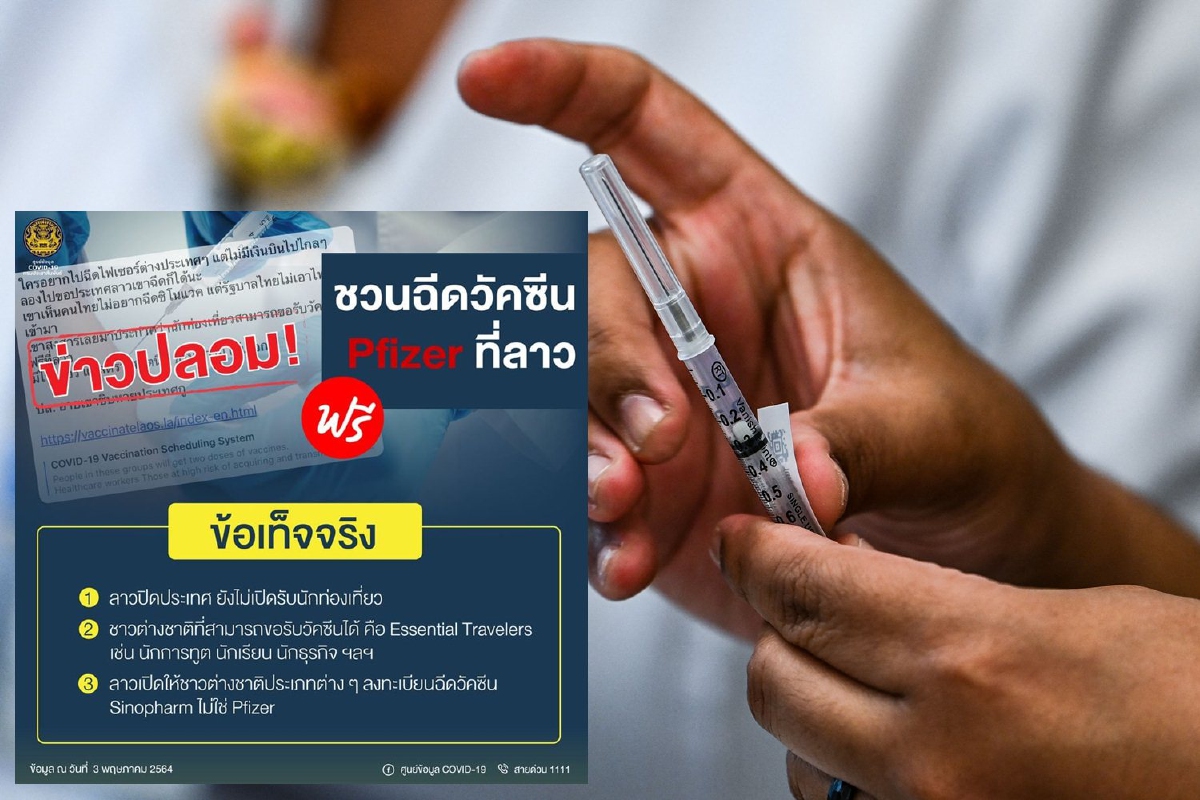 เพจไทยรู้สู้โควิดแจงข่าวปลอมอ้างฉีดวัคซีน Pfizer ที่ลาวฟรี ชี้ สปป.ลาวยังไม่เปิดรับนักท่องเที่ยว ชาวต่างชาติที่ขอรับวัคซีนได้ต้องเป็น "Essential Travelers" ไม่ใช่นักท่องเที่ยวทั่วไป และวัคซีนที่ฉีดเป็นยี่ห้อ Sinopharm ไม่ใช่ Pfizer