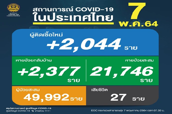 เมื่อวันที่ 7 พ.ค. 64 ศูนย์บริหารสถานการณ์โควิด-19 (ศบค.) รายงานสถานการณ์ผู้ติดเชื้อโควิด-19ประจำวัน พบผู้ติดเชื้อใหม่ 2,044 ราย ส่งผลให้ยอดผู้ป่วยสะสมอยู่ที่ 78,855 ราย โดยเป็นผู้ป่วยสะสมระลอก เม.ย. 49,992 คนและมีผู้เสียชีวิตเพิ่มขึ้น 27 ราย ทำให้ยอดสะสมอยู่ที่ 363 ราย หายป่วยกลับบ้านเพิ่ม 2,377 ราย