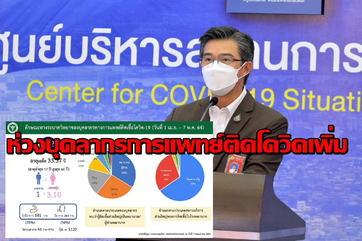 "ข้อมูลตั้งแต่การระบาดรอบใหม่ (1 เม.ย.- 7 พ.ค.64) พบว่ามีบุคลากรทางการแพทย์ติดเชื้อโควิด-19 แล้ว 512 ราย จากท้งหมด 57 จังหวัด สูงสุดอยู่ในกรุงเทพฯ 137 ราย รองลงมา ตรัง 47 ราย ชลบุรี 34 ราย และนครปฐม 25 ราย ซึ่งปัจจัยเสี่ยงของการติดเชื้อ ส่วนใหญ่มาจากการสัมผัส/การรักษาผู้ป่วย ขณะที่ปฏิบัติหน้าที่ในภายใน รพ. รวมทั้งการสัมผัสกับเพื่อนร่วมงานที่ป่วย โดยบุคลากรทางการแพทย์ที่ติดเชื้อ ส่วนใหญ่เป็นพยาบาลและผู้ช่วยพยาบาล 34% แพทย์ 10% ทันตแพทย์ 5%"โฆษกศบค.กล่าว