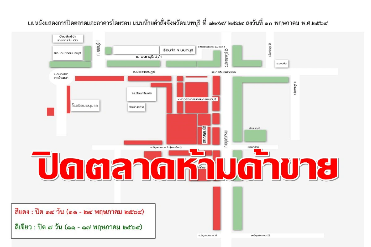 นายสุจินต์ ไชยชุมศักดิ์ ผู้ว่าราชการจังหวัดนนทบุรี มีคำสั่ง จ.นนทบุรี ที่ 1294/2564 ลงวันที่ 10 พ.ค. สั่งปิดสถานที่เป็นการชั่วคราว (ฉบับที่ 40) โดยสั่งปิดตลาดสดเทศบาลนครนนทบุรี ตลาดสดสมบัติ (ท่าน้ำนนทบุรี) อาคารพาณิชย์ อาคารประกอบการร้านค้า รถเข็น หาบเร่ แผงลอยทุกประเภท โดยเป้นพื้นที่สีแดงเริ่มวันที่ 11-24 พ.คนี้ และ สีเขียวเริ่มวันที่ 11-17 พ.ค.นี้
