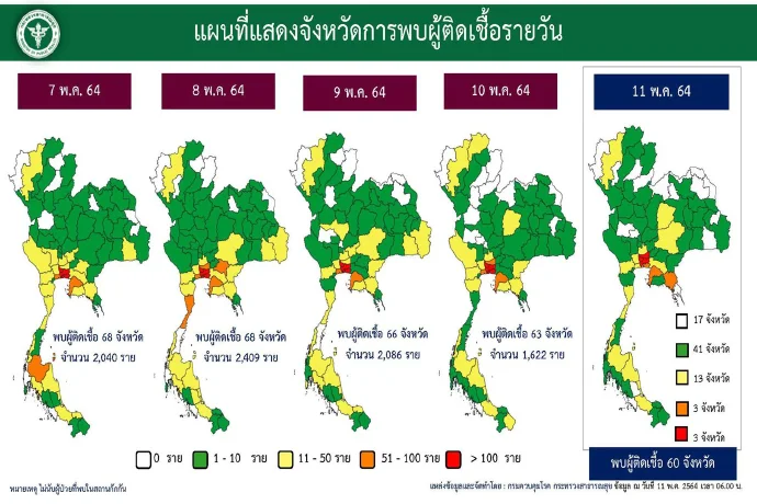 เมื่อวันที่ 11 พ.ค. 64 นพ.ทวีศิลป์ วิษณุโยธิน โฆษกศูนย์บริหารสถานการณ์โควิด-19 กล่าวว่า ถ้าดูจากแผนที่ประเทศไทยวันนี้ จะพบว่ามีถึง 17 จังหวัด ที่ไม่พบผู้ติดเชื้อรายใหม่ ประกอบด้วย ชัยนาท แพร่ อุตรดิตถ์ หนองคาย อำนาจเจริญ แม่ฮ่องสอน บึงกาฬ หนองบัวลำภู อุทัยธานี สตูล พัทลุง ลำพูน ศรีษะเกษ นครพนม ตราด สกลนคร และ เลย