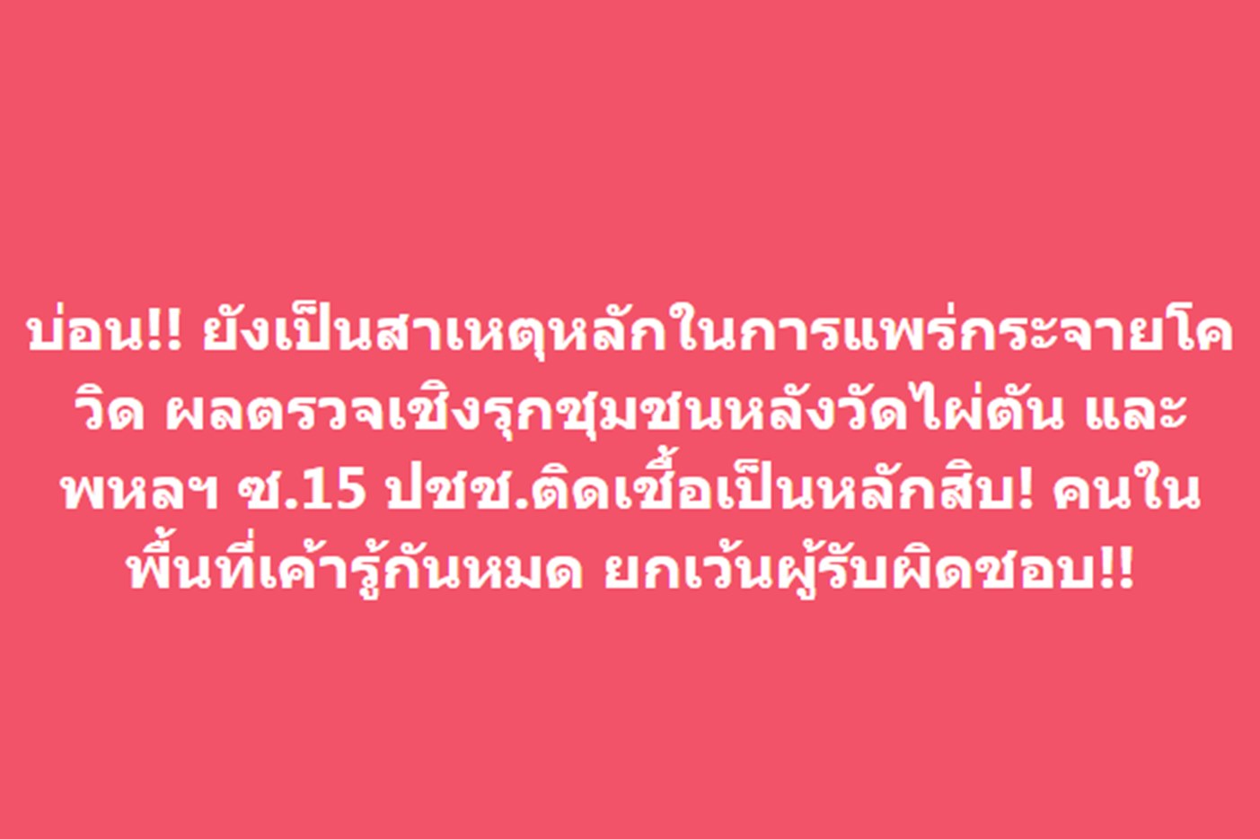 ซึ่งจากการตรวจสอบร่วมกับสำนักงานเขตพญาไท ผลการตรวจสอบข้อมูลการสอบสวนโรคปรากฏว่า บุคคลที่ติดเชื้อโควิดดังกล่าวไม่ได้มาจากบ่อนการพนันในพื้นที่วัดไผ่ตันและซอยพหลโยธิน 15 ตามที่เป็นข่าวแต่อย่างใด แต่เป็นการติดเนื่องจากการสัมผัสใกล้ชิดกับผู้มีความเสี่ยงจำนวน 7 ราย ในตอนนี้สามารถติดต่อได้ 5 ราย ไม่สามารถติดต่อได้จำนวน 2 ราย ทั้ง 5 รายปกติพักอาศัยอยู่แถวชุมชนวัดไผ่ตัน, ชุมชนถวัลย์ศักดิ์, ท่าน้ำหลังวัดไผ่ตันโดยในช่วงวันที่ 28 เม.ย.-6 พ.ค. แต่ละคนได้มีการไปนั่งรับประทานอาหาร พบปะกับเพื่อนและกลุ่มคนที่รู้จักภายในชุมชน ต่อมาทราบว่ามีเพื่อนในกลุ่มติดเชื้อ จึงได้ทยอยไปตรวจผลตรวจพบว่าติดเชื้อ