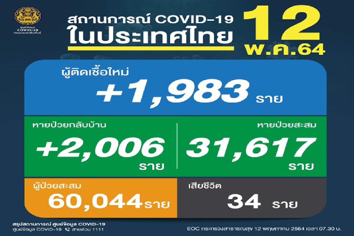ศบค.รายงานยอดผู้ติดเชื้อโควิดใหม่ 1,983 ราย เสียชีวิตอีก 34 ราย ขณะที่ผู้ป่วยได้รับการรักษาหายเพิ่มขึ้น 2,006 ราย