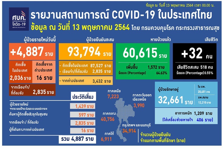 เมื่อวันที่ 13 พ.ค. 64 ศูนย์บริหารสถานการณ์โควิด-19 รายงานสถานการณ์แพร่ระบาดของโรคติดเชื้อโควิด-19 ประจำวัน โดยมีรายละเอียดดังนี้