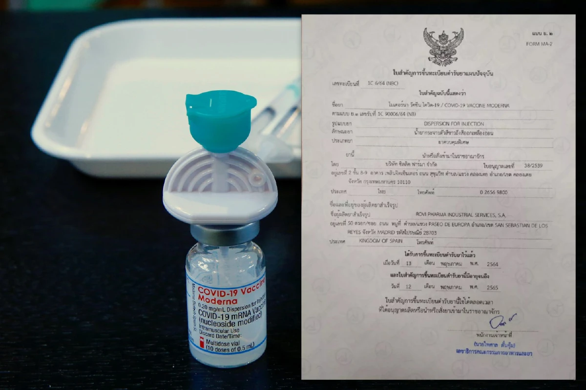 ทั้งนี้ ใบสำคัญการขึ้นทะเบียนตำรับยาแผนปัจจุบัน ระบุว่า ชื่อยา “โมเดอร์นา วัคซีนโควิด-19 /covid-19 vaccine moderna ตามแบบ ย.1 เลขรับที่ 1C 90006/64 (NB) รูปแบบยา DISPERSION FOR INJECTION ลักษณะยา น้ำยากระจายตัวสีขาวถึงสีออกเหลืองอ่อน ประเภทยา เป็นยาควบคุมพิเศษ