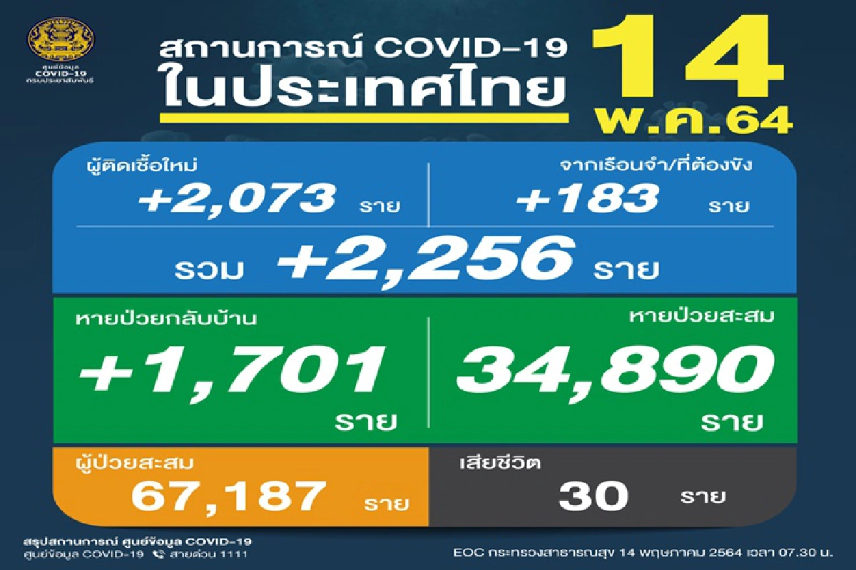 ศบค.รายงานยอดผู้ติดเชื้อโควิดใหม่ 2,256 ราย มาจากคลัสเตอร์เรือนจำ 183 ราย เสียชีวิตอีก 30 ราย ขณะที่ผู้ป่วยได้รับการรักษาหายเพิ่มขึ้น 1,701 ราย