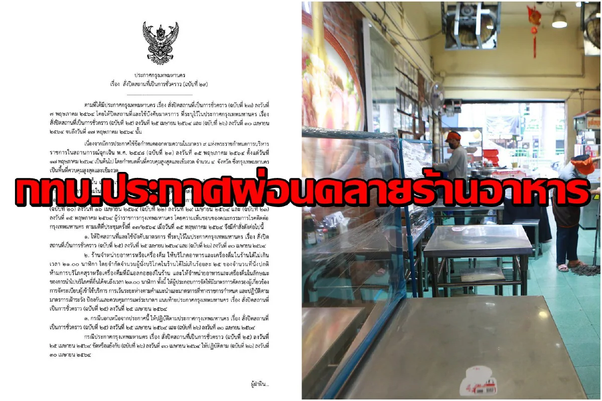 กทม.ออกประกาศผ่อนคลายมาตรการให้ร้านอาหารสามารถนั่งรับประทานในร้านได้ไม่เกิน 25% ของจำนวนที่นั่งปกติในเวลาไม่เกิน 21.00 น.