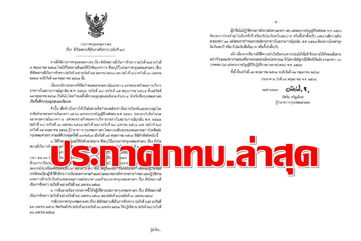 ซึ่งมีมติให้ร้านอาหาร สามารถนั่งรับประทานอาหารในร้านได้ ไม่เกิน 21.00 น. โดยนั่งได้ไม่เกิน 25% ของจำนวนที่นั่งปกติ จำหน่ายอาหารแบบนำไปบริโภคที่อื่นได้ (Take away) ไม่เกิน 23.00 น. ห้ามดื่มสุราหรือเครื่องดื่มแอลกอฮอล์ในร้าน และให้ปฏิบัติตามมาตรการอย่างเคร่งครัดและยังคงปิดสถานที่ตามประกาศกรุงเทพมหานครปิดสถานที่เป็นการชั่วคราว (ฉบับที่ 25) และ (ฉบับที่ 26) ต่อไป โดยมีผลตั้งแต่วันที่ 17 - 31 พ.ค. 64 ตามประกาศกรุงเทพมหานคร เรื่องสั่งปิดสถานที่เป็นการชั่วคราว (ฉบับที่ 29)