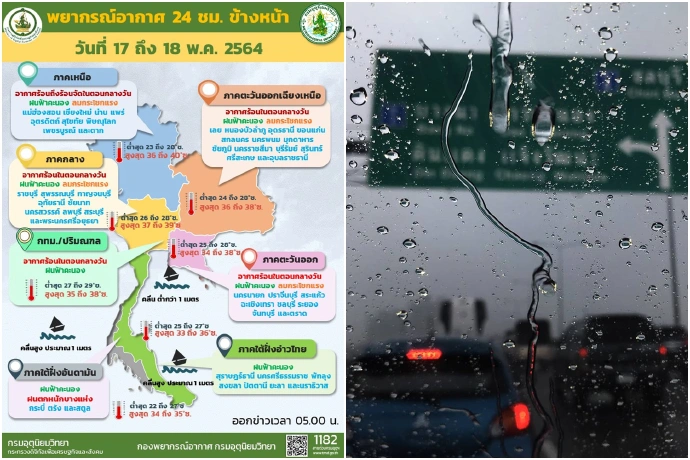 เมื่อวันที่ 17 พ.ค. 64 กรมอุตุนิยมวิทยารายงาน ลักษณะอากาศทั่วไปว่า พยากรณ์อากาศ 24 ชั่วโมงข้างหน้า ประเทศไทยตอนบนมีอากาศร้อนในตอนกลางวัน กับมีอาการ้อนจัดบางพื้นที่ในบริเวณภาคเหนือ โดยมีฝนฟ้าคะนองและลมกระโชกแรงบางพื้นที่บริเวณภาคเหนือ ภาคตะวันออกเฉียงเหนือ และภาคตะวันออก ทั้งนี้เนื่องจากมีลมตะวันตกเฉียงใต้และลมตะวันออกเฉียงใต้พัดปกคลุมภาคเหนือ ภาคตะวันออกเฉียงเหนือ ภาคตะวันออก และภาคกลาง