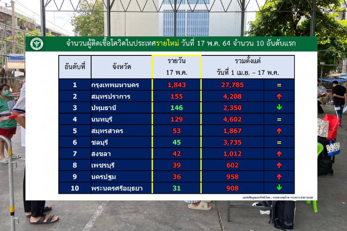 กรมควบคุมโรคเผยตัวเลขผู้ติดเชื้อโควิดสะสมสูงสุดรายวันยังเป็นกทม.นำโด่งจำนวน 1,843 ราย สมุทรปราการอันดับ 2 ตามด้วยปทุมธานี 146 และนนทบุรี 129 ราย