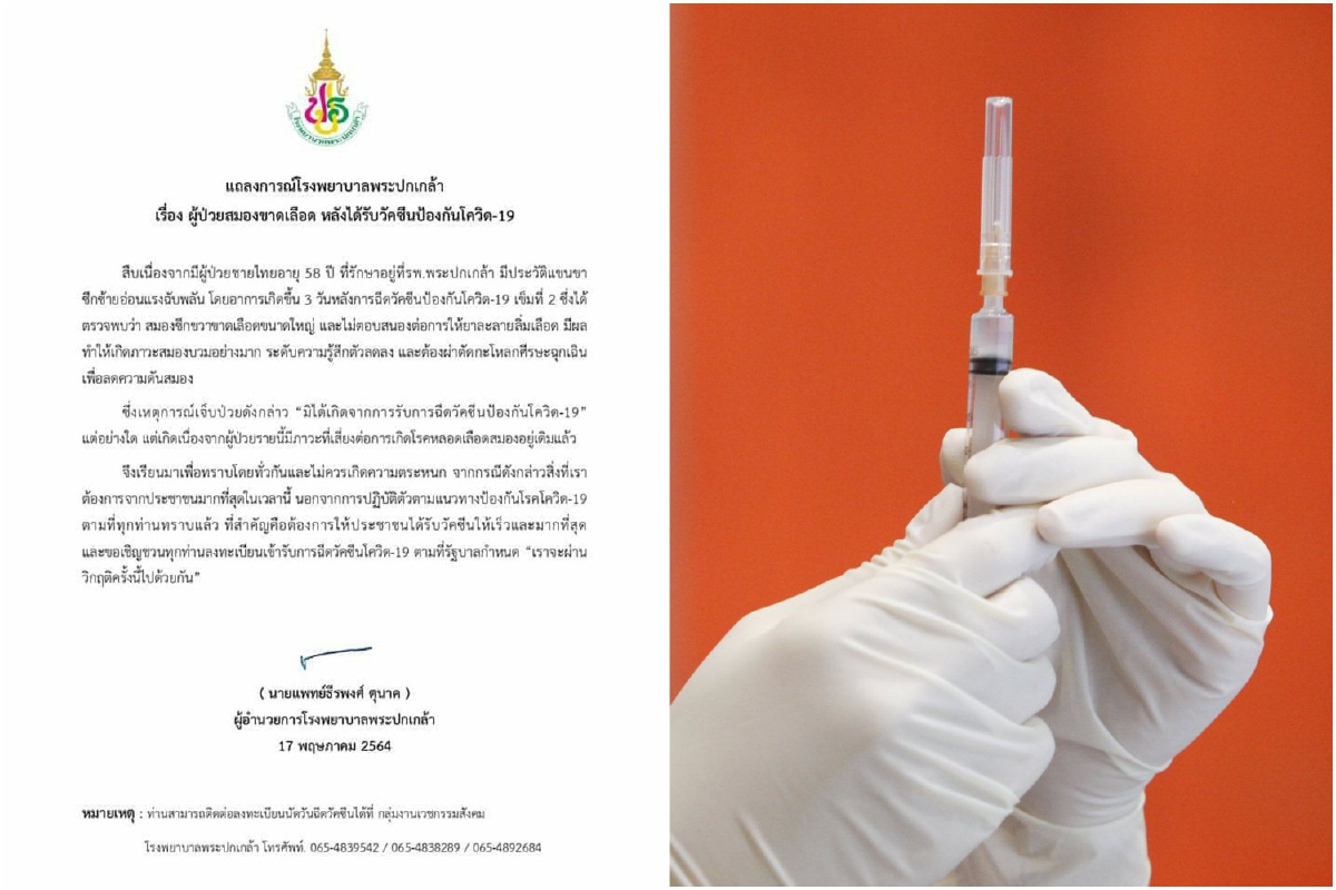 สืบเนื่องจากมีผู้ป่วยชายไทยอายุ 58 ปี ที่รักษาอยู่ที่โรงพยาบาลพระปกเกล้า มีประวัติแขนขาซีกซ้ายอ่อนแรงฉับพลัน โดยอาการเกิดขึ้น 3 วัน หลังการฉีดวัคซีนป้องกันโควิด-19 เข็มที่ 2 ซึ่งได้ตรวจพบว่า สมองซีกขวาขาดเลือดขนาดใหญ่ และไม่ตอบสนองต่อการให้ยาละลายลิ่มเลือด มีผลทำให้เกิดภาวะสมองบวมอย่างมาก ระดับความรู้สึกตัวลดลง และต้องผ่าตัดกะโหลกศีรษะฉุกเฉินเพื่อลดความดันสมอง