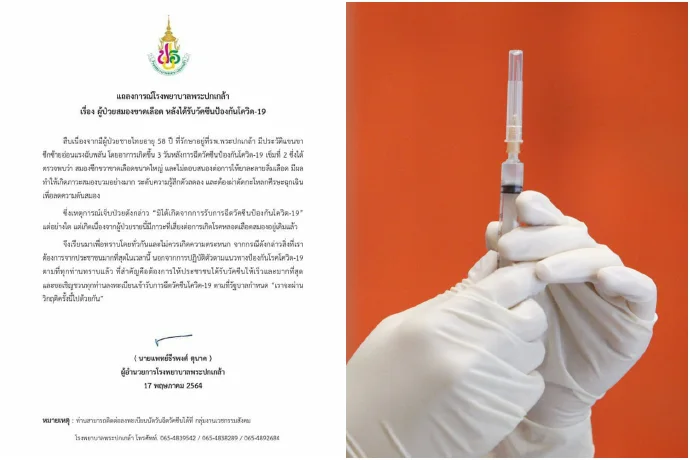 โรงพยาบาลพระปกเกล้าชี้แจง ผู้ป่วยสมองขาดเลือด มีอาการหลังฉีดวัคซีนโควิดเข็ม2เป็นเวลา 3 วัน ไม่ได้มีสาเหตุจากวัคซีน แต่เป็นเพราะผู้ป่วยมีภาวะเสี่ยงต่อการเกิดโรคหลอดเลือดสมองอยู่เดิมแล้ว