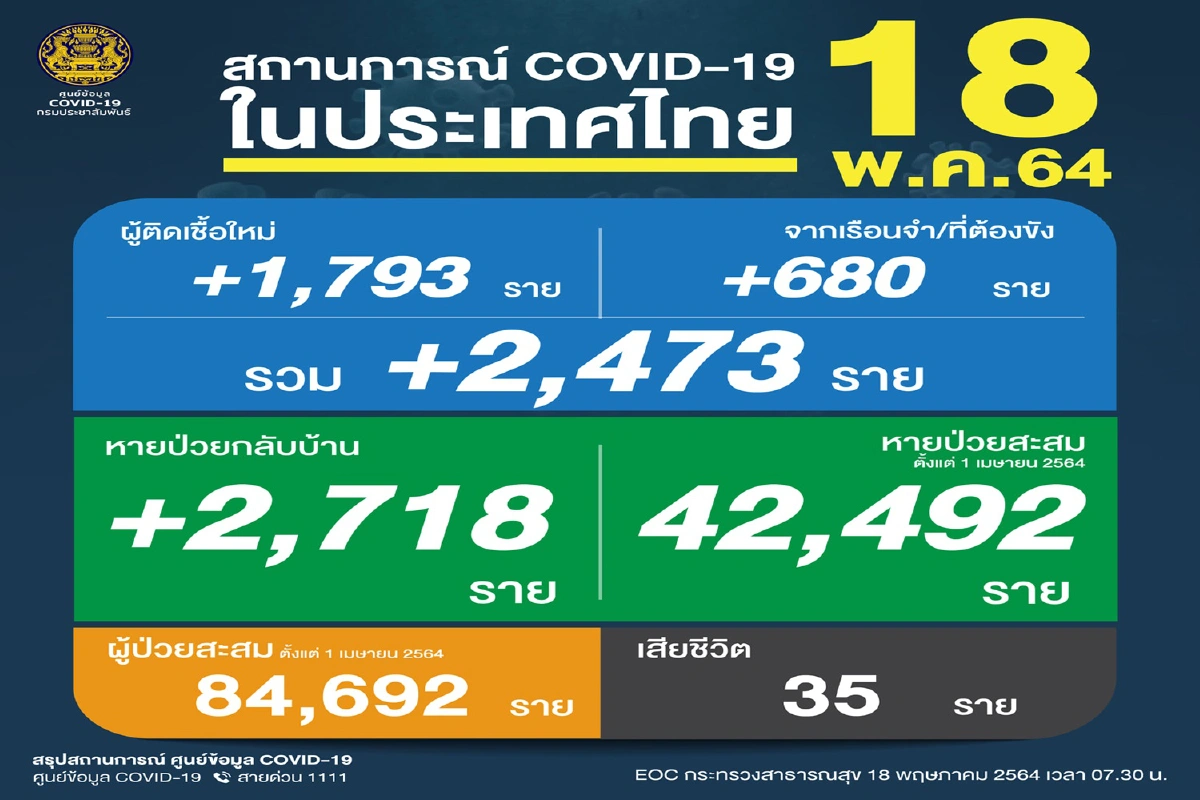 ศบค.รายงานพบผู้ติดเชื้อโควิดใหม่ 2,473 ราย แบ่งเป็นติดเชื้อใหม่ 1,793 ราย และติดเชื้อภายในเรือนจำ 680 ราย ขณะที่ผู้เสียชีวิตเพิ่มอีก 35 ราย ผู้ป่วยรักษาหายกลับบ้านได้เพิ่ม 2,718 ราย