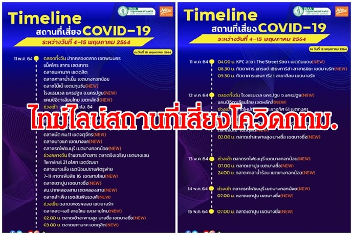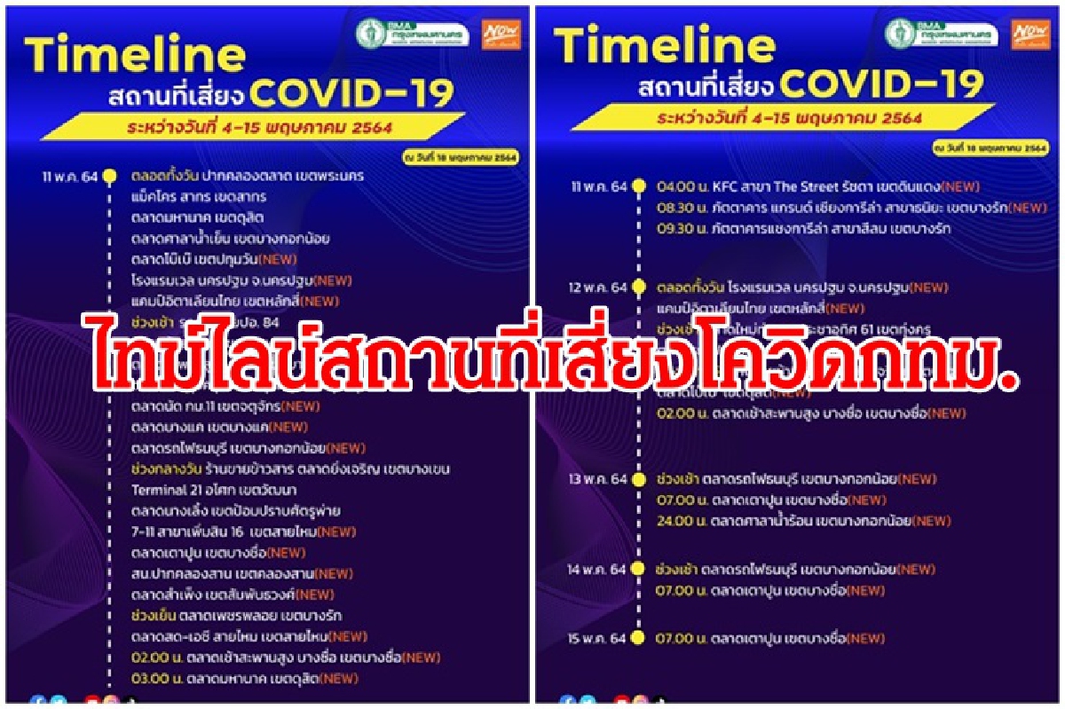เพจเฟซบุ๊ก กรุงเทพมหานคร โดยสำนักงานประชาสัมพันธ์ โพสต์ข้อความอัพเดทไทม์ไลน์เพิ่มเติม สถานที่เสี่ยงโควิด-19 ที่อยู่ใน กทม. ข้อความดังนี้ อัพเดต Timeline เพิ่มเติม สถานที่เสี่ยง COVID-19 ระหว่างวันที่ 4-15 พ.ค. 2564 (ข้อมูล ณ วันที่ 18 พฤษภาคม 2564) โดยเพิ่มจุดเสี่ยงใหม่ อีก 169 แห่ง มีรายละเอียดตามรูปด้านล่าง