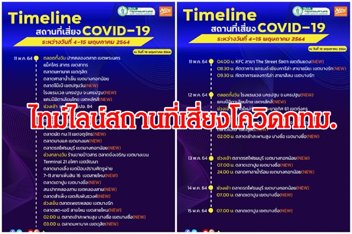 กองประชาสัมพันธ์ กทม.อัพเดต ไทม์ไลน์ สถานที่เสี่ยงโควิด-19 เพิ่มเติม ช่วง 4-15 พค. อีก 169 แห่ง มีทั้ง ตลาด แคมป์คนงาน ภัตตาคาร โรงแรม สถานีตำรวจ ฯลฯ