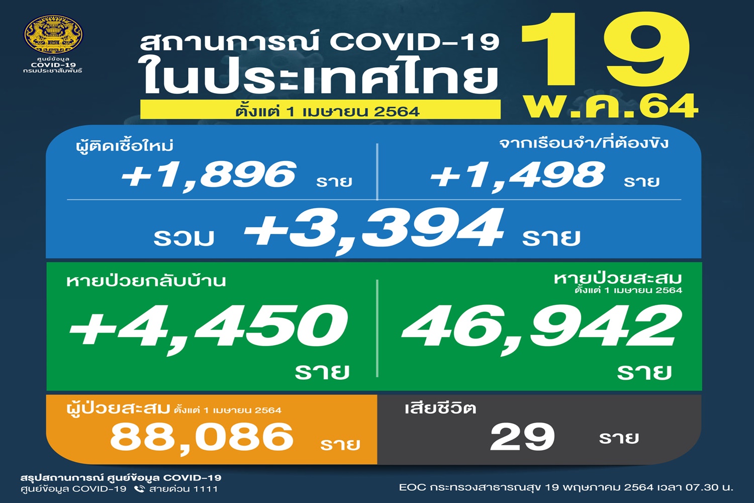 ศบค.รายงานพบผู้ติดเชื้อโควิดรายใหม่ 3,394 ราย เป็นผู้ติดเชื้อในเรือนจำ 1,498 ราย เสียชีวิตเพิ่ม 29 ราย หายป่วยอีก 4,450 ราย