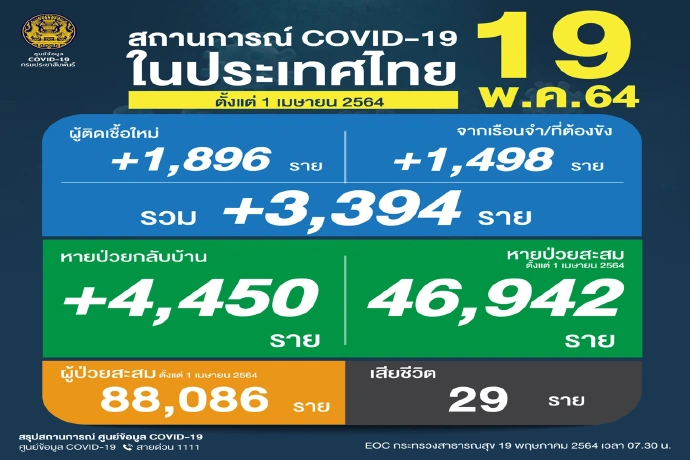 ไทยป่วยโควิดเพิ่ม 3,394ราย เสียชีวิตอีก 29 ราย