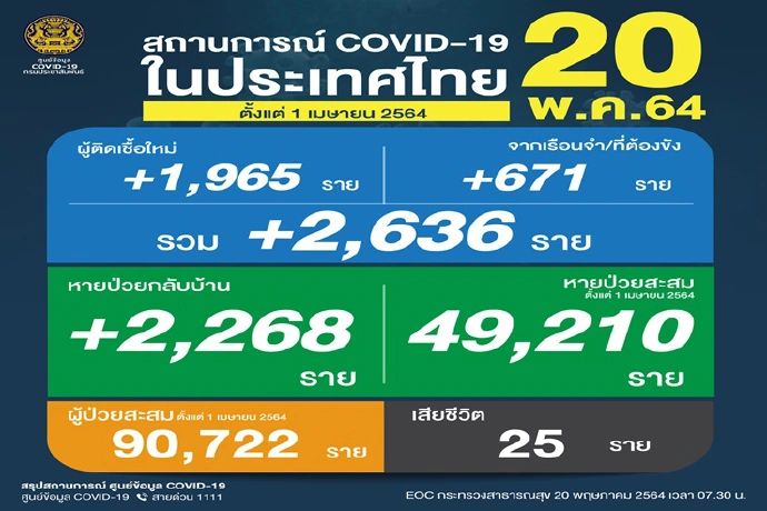 ศบค.รายงานพบผู้ติดเชื้อโควิดรายใหม่2,636 ราย เป็นผู้ติดเชื้อในเรือนจำ 671 ราย เสียชีวิตเพิ่ม 25 ราย หายป่วยอีก 2,268 ราย