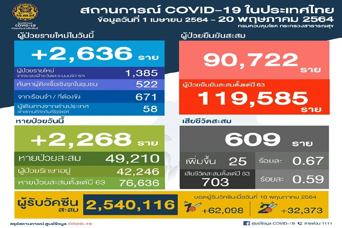 เมื่อวันที่ 20 พ.ค. 64 ศูนย์บริหารสถานการณ์โควิด-19 รายงานสถานการณ์แพร่ระบาดของโรคติดเชื้อโควิด-19 ประจำวัน โดยมีรายละเอียดดังนี้