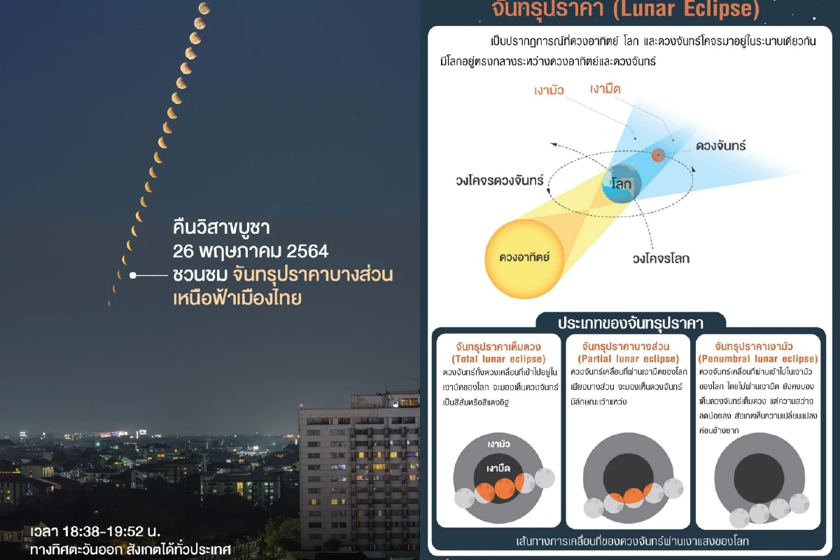 นายศุภฤกษ์ คฤหานนท์ หัวหน้างานบริการวิชาการดาราศาสตร์ สดร. เปิดเผยว่า ปรากฏการณ์จันทรุปราคาเต็มดวงในวันที่ 26 พฤษภาคม 2564 นั้น ตรงกับวันวิสาขบูชา ดวงจันทร์เริ่มเข้าสู่เงามัวของโลกตั้งแต่เวลา 15:47 น. จากนั้นค่อย ๆ เคลื่อนเข้าสู่เงามืดของโลก เกิดเป็นจันทรุปราคาบางส่วนในเวลา 16:44 น. และเข้าสู่จันทรุปราคาเต็มดวงตั้งแต่เวลา 18:11-18:25 น. แต่ในวันดังกล่าว ในประเทศไทยดวงจันทร์จะโผล่พ้นจากขอบฟ้าเวลาประมาณ 18:38 น. ทำให้ผู้สังเกตในไทยมีโอกาสมองเห็นเป็นเพียง “จันทรุปราคาบางส่วน” เท่านั้น