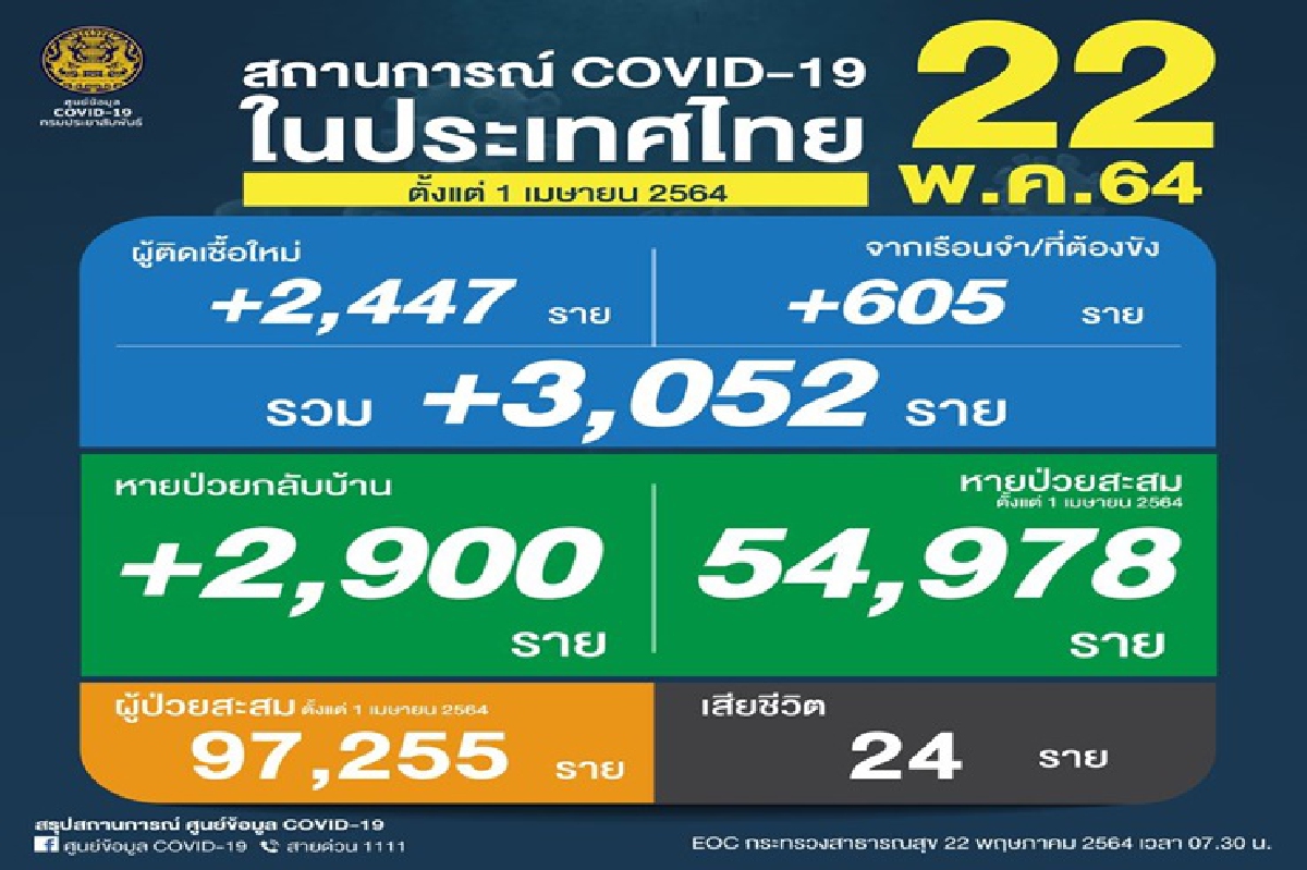 -พบผู้ป่วยรายใหม่ 3,052 ราย จำแนกเป็น ผู้ติดเชื้อใหม่ 2,447 ราย และ ผู้ติดเชื้อภายในเรือนจำ/ที่ต้องขัง605ราย