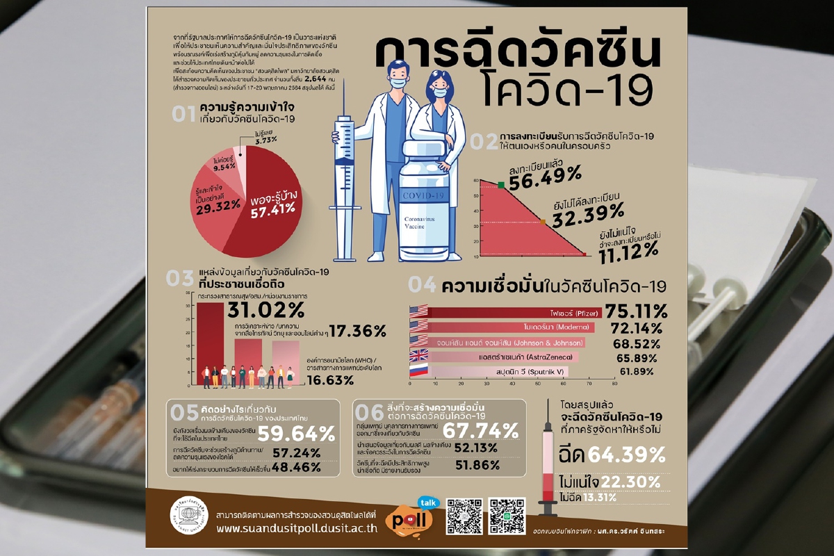 สวนดุสิตโพล มหาวิทยาลัยสวนดุสิต สำรวจความคิดเห็นของประชาชนต่อกรณี “การฉีดวัคซีนโควิด-19” กลุ่มตัวอย่างจำนวน 2,644 คน สำรวจวันที่ 17-20 พฤษภาคม 2564 สรุปผลได้ดังนี้