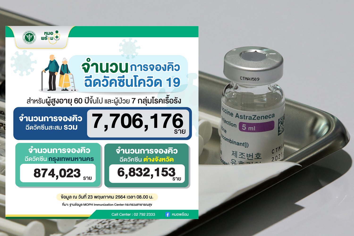 เมื่อวันที่ 23 พ.ค. 64 เพจเฟซบุ๊ก "หมอพร้อม" รายงานจำนวนการจองคิวฉีดวัคซีนโควิด-19 สำหรับผู้สูงอายุ 60ปีขึ้นไปและผู้ป่วย 7 กลุ่มโรคเรื้อรัง พบว่า มีจำนวนการของคิวฉีดวัคซีนสะสม 7,706,176 ราย แบ่งเป็นจำนวนการจองคิวในกทม. 874,023 ราย และ การจองคิวในต่างจังหวัด 6,832,153 ราย