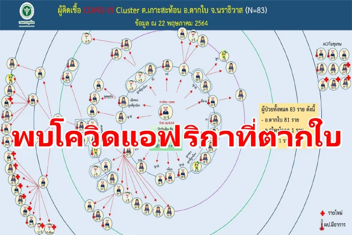 เมื่อวันที่ 23 พ.ค. 64 นพ.โอภาส การย์กวินพงศ์ อธิบดีกรมควบคุมโรค แถลงถึงกรณีพบผู้ติดเชื้อโควิด-19 สายพันธุ์แอฟริกาใต้ ในพื้นที่ต.เกาะสะท้อน อ.ตากใบ จ.นราธิวาสว่า พื้นที่ดังกล่าวเป็นคลัสเตอร์การระบาดมีผู้ติดเชื้อโควิดรวม 83 ราย ในจำนวนนี้ พบว่ามี 3 ราย ติดเชื้อไวรัสโควิด-19 สายพันธุ์แอฟฟริกาใต้ หลังจากที่มีการสุ่มตรวจสายพันธุ์ไวรัสจากกลุ่มผู้ติดเชื้อ