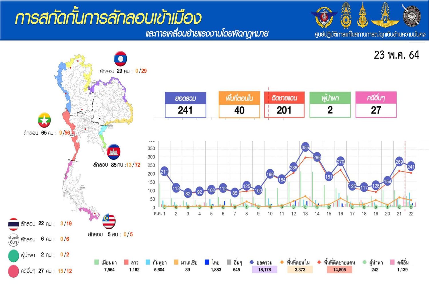 นพ.ทวีศิลป์ วิษณุโยธิน โฆษกศูนย์บริหารสถานการณ์ โควิด-19 (ศบค.) กล่าวว่า วันนี้ศูนย์ปฏิบัติการแก้ไขสถานการณ์ฉุกเฉินด้านความมั่นคง รายงานว่าสามารถสกัดกั้นการลักลอบเข้าเมืองได้ 241 ราย ซึ่งถือเป็นตัวเลข 200 กว่ามาสองวันแล้ว จึงได้ขอให้เพิ่มมาตรการเป็น 2 ระดับ คือ ระดับที่ 1 คือผู้ที่ทำหน้าที่อยู่แนวขอบชายแดน คือฝ่ายมั่นคง และก็ตำรวจ รวมถึงตำรวจตระเวนชายแดนด้วย ขอให้เพิ่มกำลัง และเครื่องมืออิเล็กทรอนิกส์ให้มากขึ้น หรืออาจตั้งด่าน 2 แนว 3 แนว ตั้งด่านให้เพิ่มขึ้น