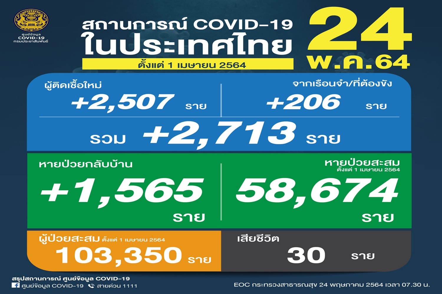 ศบค.พบผู้ติดเชื้อโควิดเพิ่ม 2,713 ราย มาจากเรือนจำ 206 ราย ขณะที่ผู้เสียชีวิตเพิ่มขึ้นอีก 30 ราย ผู้ป่วยได้รับการรักษาหายเพิ่ม 1,565 ราย