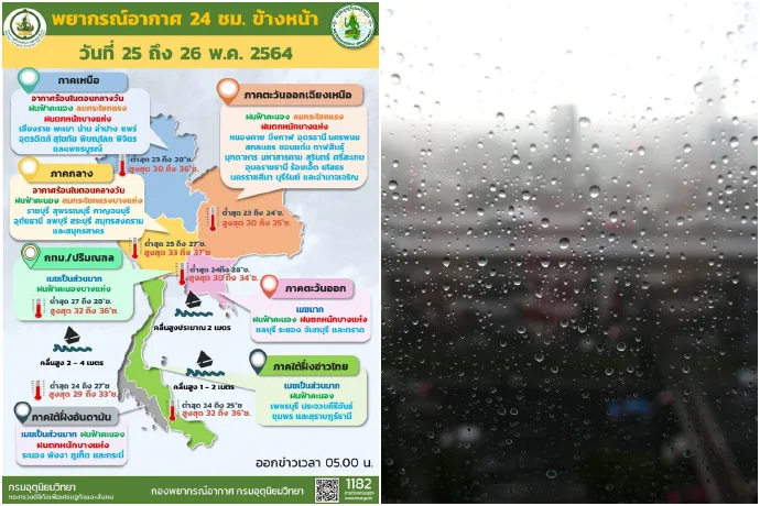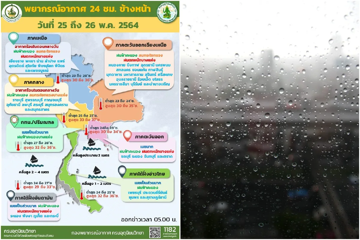 เมื่อวันที่ 25 พ.ค. 64 กรมอุตุนิยมวิทยารายงาน ลักษณะอากาศทั่วไปว่า พยากรณ์อากาศ 24 ชั่วโมงข้างหน้า บริเวณประเทศไทยตอนบนมีฝนเพิ่มขึ้น และมีฝนตกหนักบางแห่งในภาคเหนือ ภาคตะวันออกเฉียงเหนือ และภาคตะวันออก เนื่องจากมีร่องมรสุมพาดผ่านภาคเหนือตอนล่าง และภาคตะวันออกเฉียงเหนือ ประกอบกับมรสุมตะวันตกเฉียงใต้ที่พัดปกคลุมทะเลอันดามัน ภาคใต้ และอ่าวไทย มีกำลังแรงขึ้น ทำให้ภาคใต้มีฝนตกหนักบางพื้นที่ และทะเลอันดามันมีคลื่นสูง 2-4 เมตร บริเวณที่มีฝนฟ้าคะนองคลื่นสูงมากกว่า 4 เมตร ส่วนอ่าวไทยตอนบนมีคลื่นสูงประมาณ 2 เมตร บริเวณที่มีฝนฟ้าคะนองคลื่นสูงมากกว่า 2 เมตร และอ่าวไทยตอนล่างมีคลื่นสูง 1-2 เมตร บริเวณที่มีฝนฟ้าคะนองคลื่นสูงประมาณ 2 เมตร