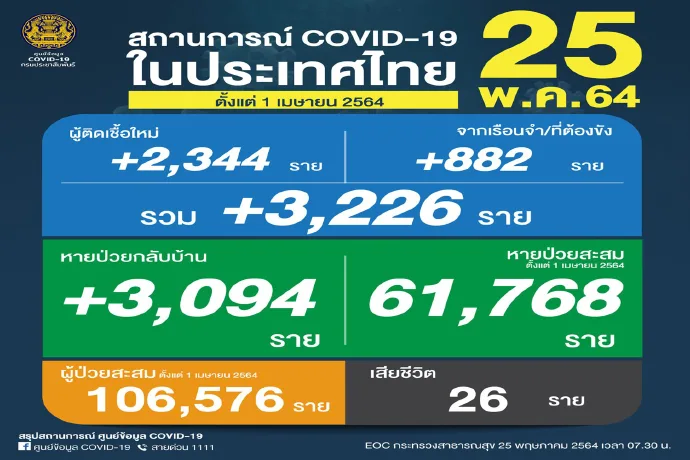 ศบค.รายงานพบผู้ติดเชื้อโควิดเพิ่ม 3,226 ราย อยู่ในเรือนจำ 882 ราย เสียชีวิตเพิ่มขึ้น 26 ราย ผู้ป่วยรักษาหายกลับบบ้านได้เพิ่มขึ้นอีก 3,094 ราย
