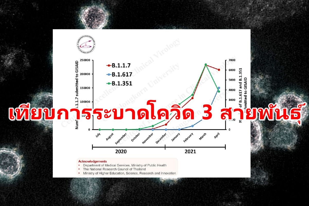 โควิด-19สายพันธุ์ที่เฝ้าระวัง และให้ความสำคัญสำหรับประเทศไทย มีสายพันธุ์อังกฤษ อินเดีย และอัฟริกาใต้ เราตรวจพบในประเทศไทยแล้วทั้ง 3 สายพันธุ์ สายพันธุ์อังกฤษ กำลังระบาดหนักทั่วโลก