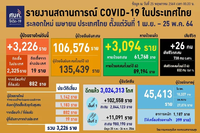 เมื่อวันที่ 25 พ.ค. 64 ศูนย์บริหารสถานการณ์โควิด-19 (ศบค.) รายงานสถานการณ์การแพร่ระบาดของไวรัสโควิด-19 ในประเทศประจำวันดังนี้