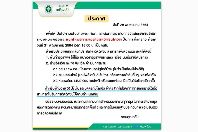 เพจเฟซบุ๊ก หมอพร้อม ประกาศว่า เพื่อให้เป็นไปตามนโยบายของศบค. และสอดคล้องกับการจัดสรรวัคซีนโควิด ระบบพร้อมจะหยุดให้บริการจองคิวฉีดวัคซีนเป็นการชั่วคราวตั้งแต่ 31 พฤษภาคม 2564 เวลา 16:00 น เป็นต้นไป