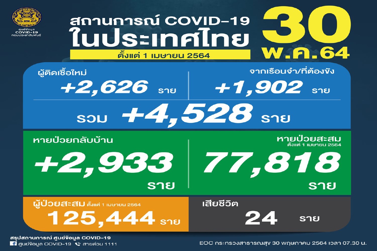 -พบผู้ติดเชื้อเพิ่ม 4,528 ราย จำแนกเป็น ติดเชื้อใหม่ 2,626 ราย ติดเชื้อภายในเรือนจำ/ที่ต้องขัง 1,902 ราย