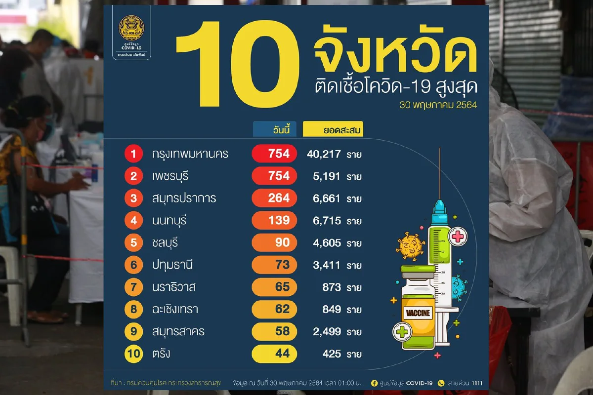- จังหวัดที่มีผู้ติดเชื้อรายใหม่สูงสุด 5 อันดับแรกคือ กทม. 754 ราย, เพชรบุรี 754 ราย, สมุทรปราการ 264 ราย, นนทบุรี 139 ราย และ ชลบุรี 90 ราย