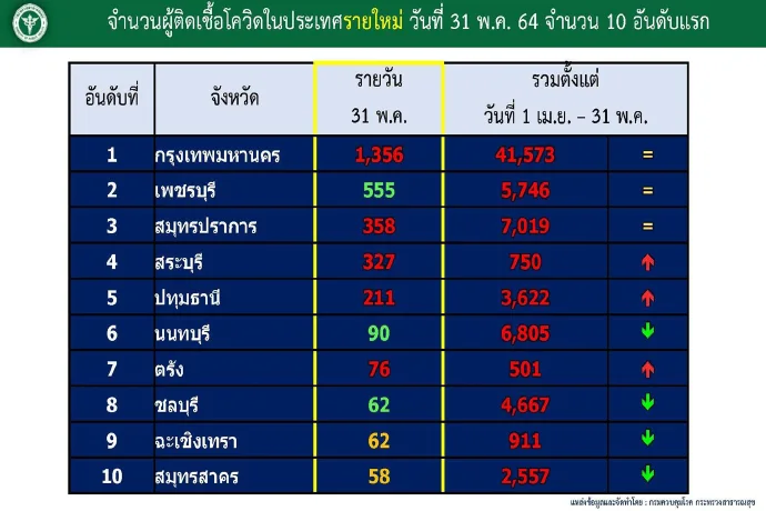 -10 จังหวัดที่พบผู้ติดเชื้อโควิด-19 สูงสุดระลอกใหม่ ประจำวันที่ 30 พ.ค.64 ได้แก่ กรุงเทพมหานคร 1,356 ราย เพชรบุรี 555 ราย สมุทรปราการ 358 ราย สระบุรี 327 ราย ปทุมธานี 211 ราย นนทบุรี 90 ราย ตรัง 76 ราย ชลบุรี 62 ราย ฉะเชิงเทรา 62 ราย สมุทรสาคร 58 ราย