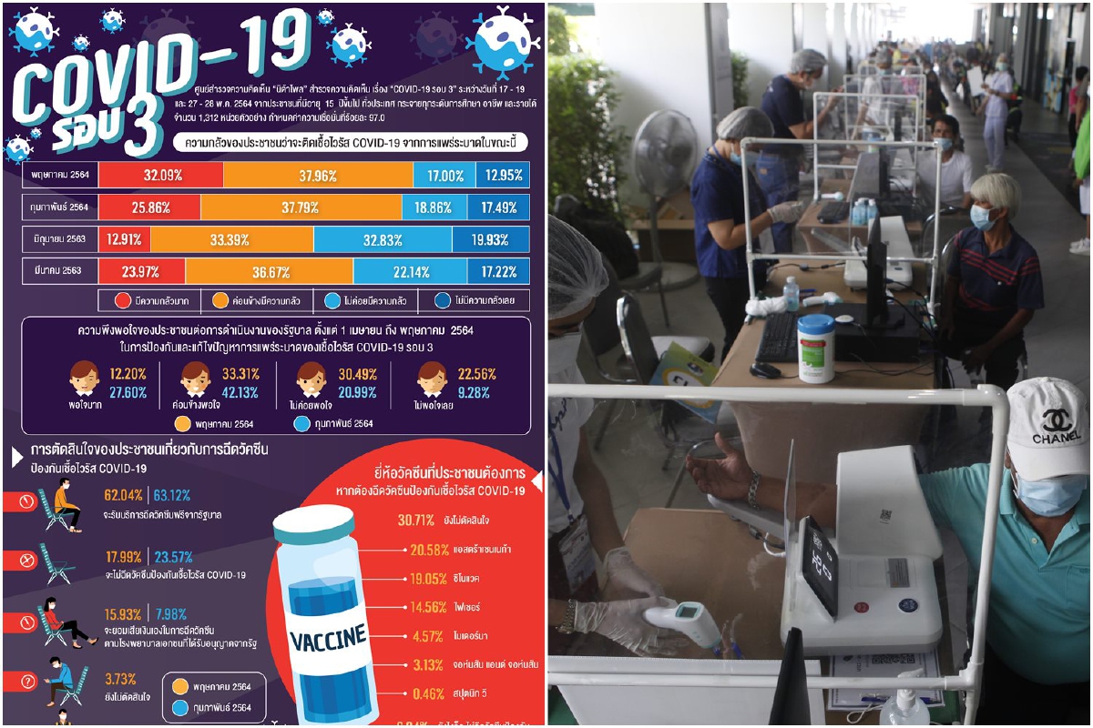 ศูนย์สำรวจความคิดเห็น “นิด้าโพล” สถาบันบัณฑิตพัฒนบริหารศาสตร์ (นิด้า) เปิดเผยผลสำรวจของประชาชน เรื่อง “COVID-19 รอบ 3” ทำการสำรวจระหว่างวันที่ 17 – 19 และ 27 – 28 พฤษภาคม 2564 จากประชาชนที่มีอายุ 15 ปีขึ้นไป กระจายทุกภูมิภาค ระดับการศึกษา และอาชีพทั่วประเทศ รวมทั้งสิ้น จำนวน 1,312 หน่วยตัวอย่าง เกี่ยวกับสถานการณ์การแพร่ระบาดของเชื้อไวรัส COVID-19 รอบ 3